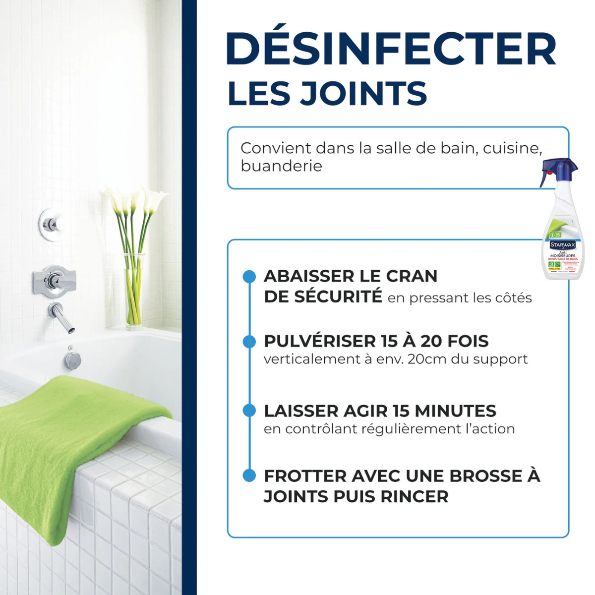 Dites adieu aux traces noires et à la moisissure dans les pièces humides. Le anti-moisissures Starwax nettoie, désinfecte et élimine efficacement les moisissures sur vos joints et surfaces de salle de bains.