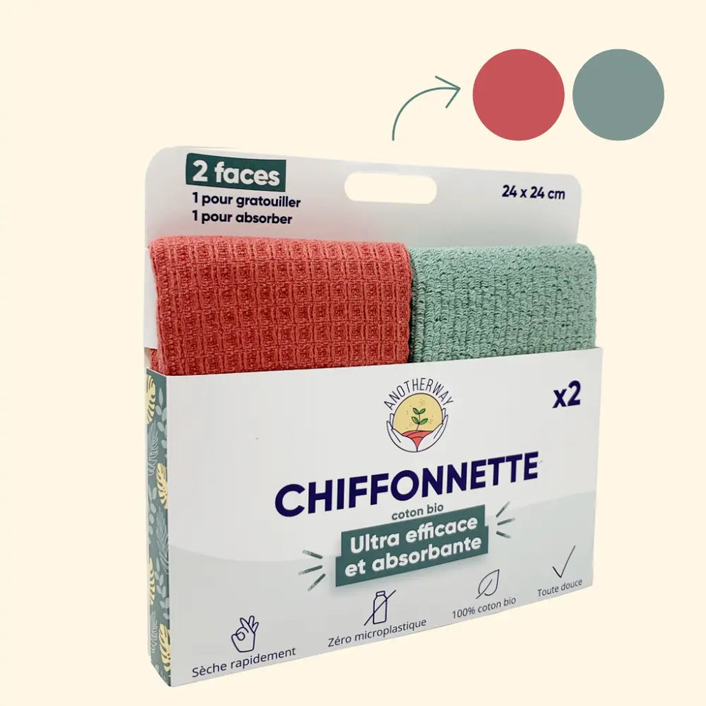 Lot de deux chiffonnette reusable en coton 100 % biologique, conçues pour un entretien efficace et zéro plastique de votre intérieur.