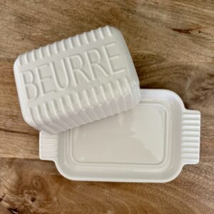 Le beurrier/confiturier en verre est un ustensile un peu oublié qui revient de plus en plus à la mode. Pourquoi ? Parce que le beurre, avant d’être emballé dans des papiers protecteurs impossibles à recycler, était déjà vendu en vrac.