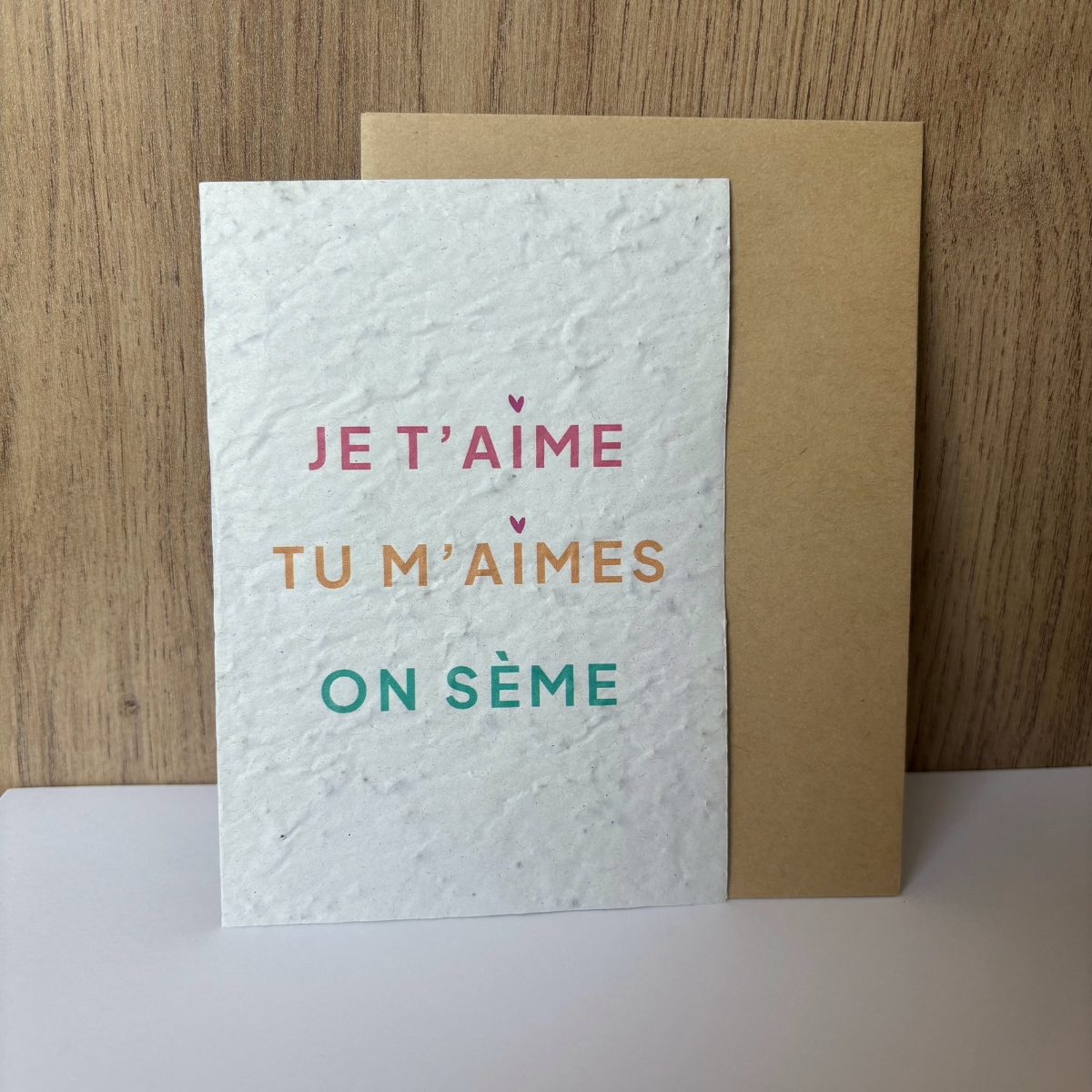 • 1-Plantez la carte : Déposez la carte ensemencée dans un pot ou dans votre jardin sur de la terre. Recouvrez-la avec une fine couche de terre d’environ 2cm. Arrosez un peu chaque jour et observez les premières graines germer au bout d’une semaine.Pour un meilleur résultat, nous vous recommandons de la planter en plein air, de mi-mai à octobre et à l’intérieur tout le reste de l’année. N’oubliez pas de lui apporter beaucoup de lumière, de la chaleur et de l’eau.