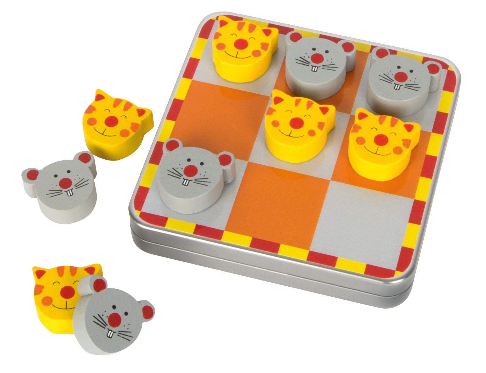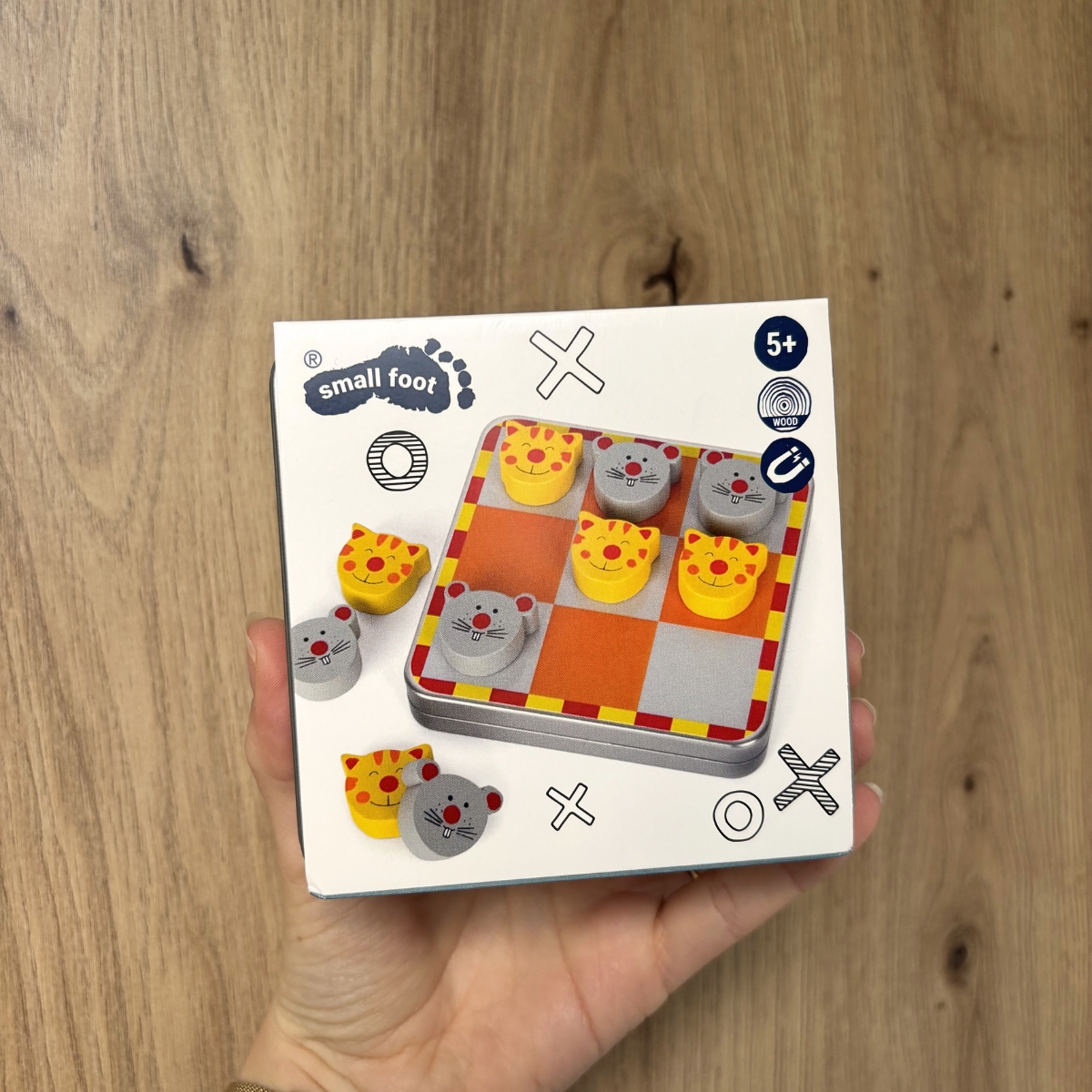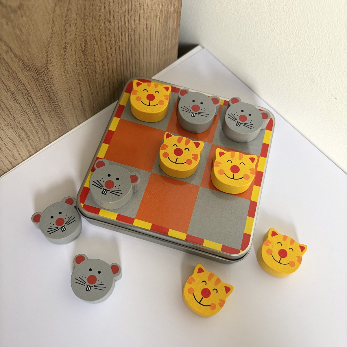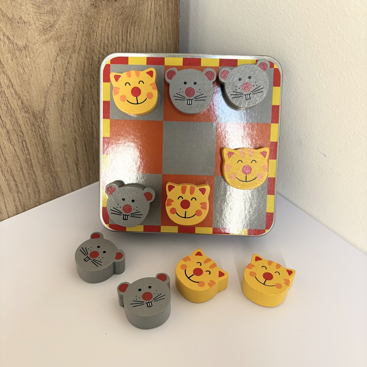 Avec ses pions en bois aimantés en forme de chats et de souris, ce morpion se joue facilement sans risque de perdre les pièces. Grâce au plateau en métal intégré à la boîte, tout reste bien en place — idéal pour jouer en voiture, en train ou en vacances.