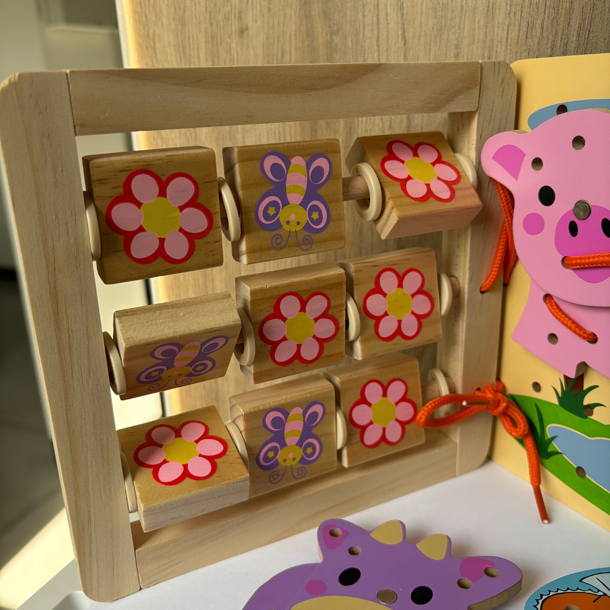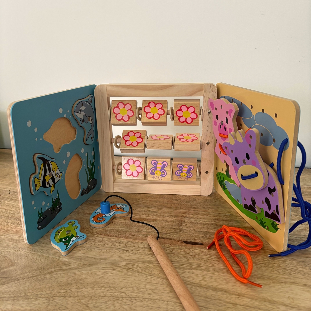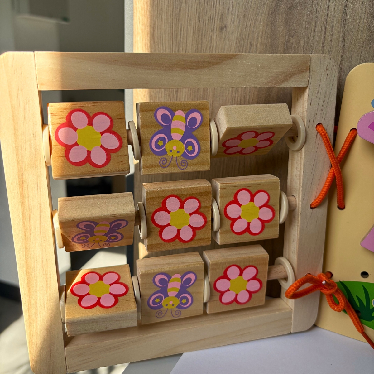 Le jeu de motricité triple est un jeu en bois multifonction conçu pour stimuler la motricité fine, la coordination et l’attention des enfants dès 2 ans.