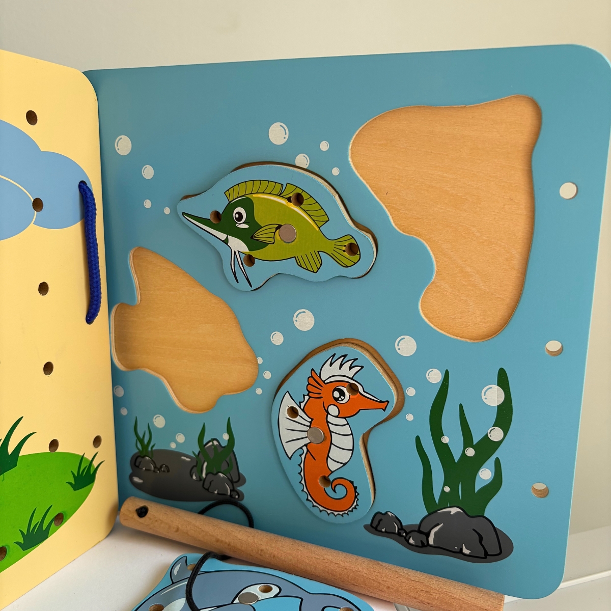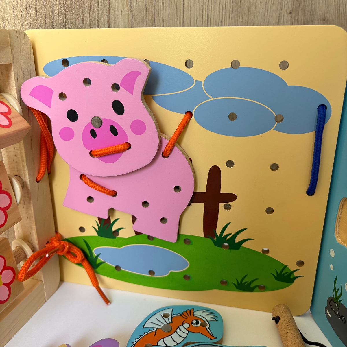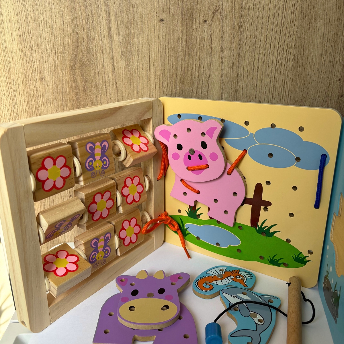 Les animaux ou pièces sont attachés via des cordes ; l’enfant doit les enfiler ou les relier selon l’ordre ou le jeu de lacets.