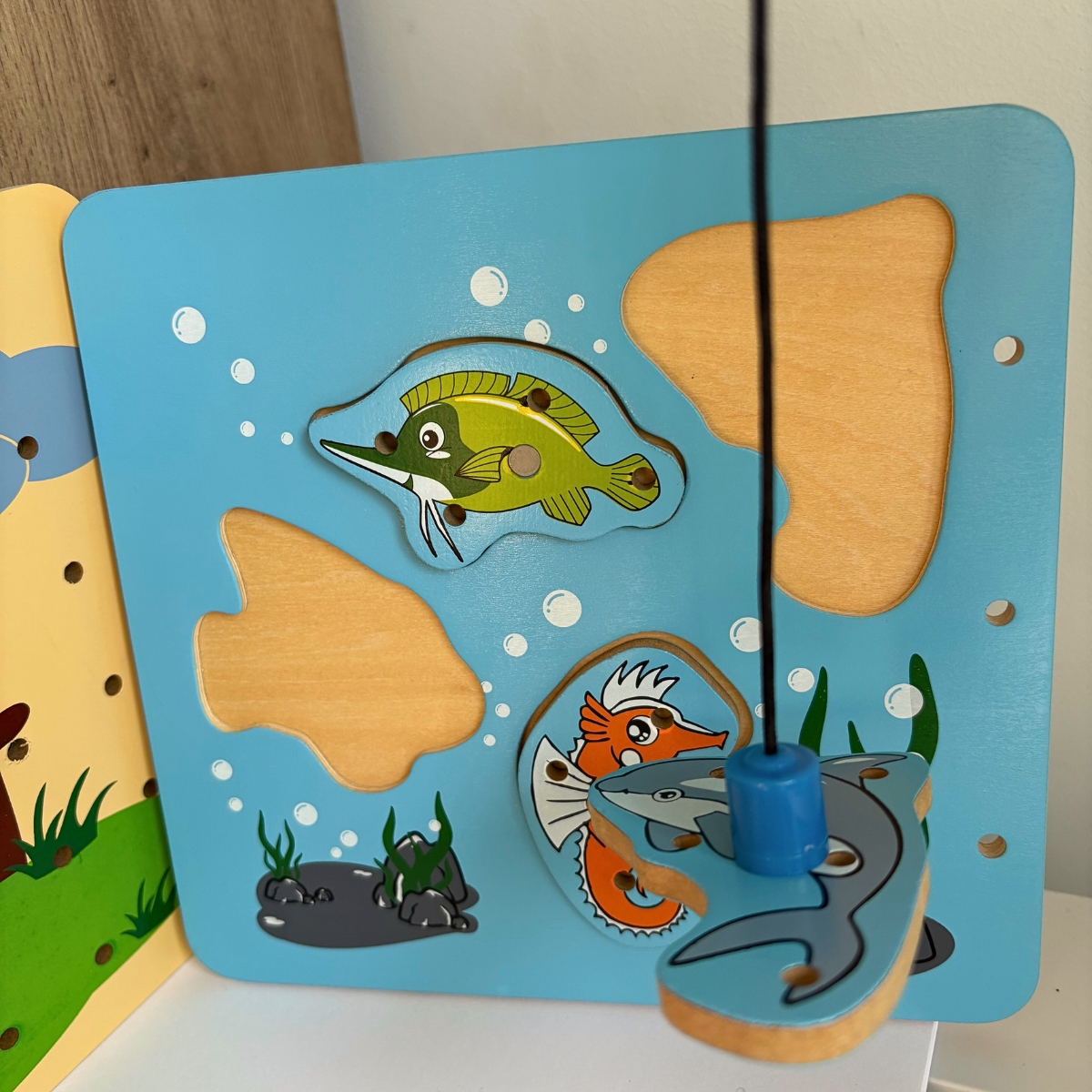 L’enfant utilise la canne magnétique pour « pêcher » les créatures aimantées (poissons, animaux…) attachées via le module.