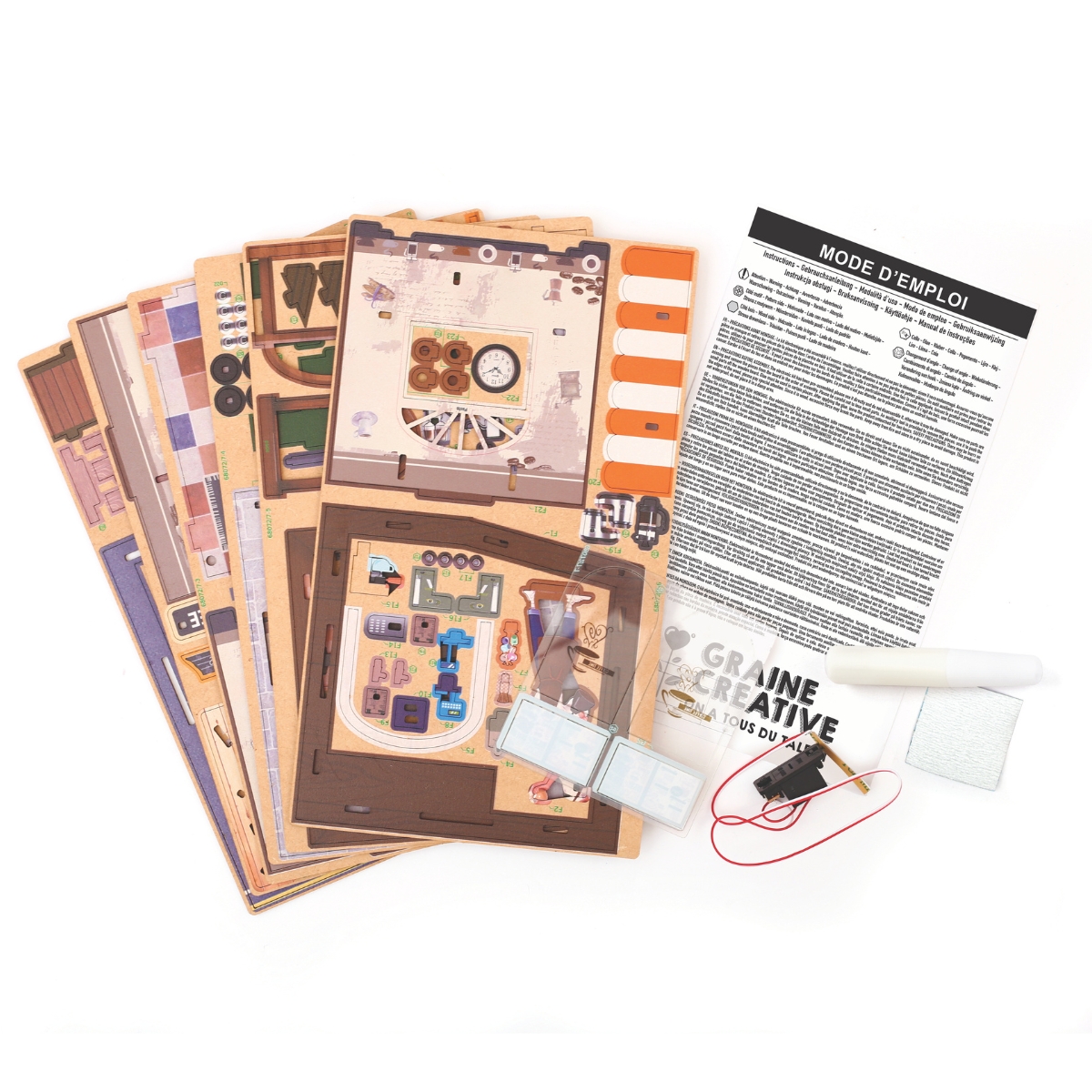 Composé de 120 pièces en bois prédécoupées, ce modèle DIY façonne une atmosphère cosy de coffee shop, avec des lumières LED chaleureuses pour sublimer votre création décorative une fois montée.